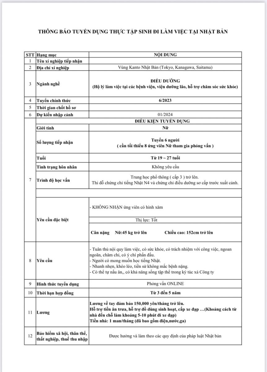 - Trình độ học vấn: tốt nghiệp cấp 3 trở lên, thi đỗ chứng chỉ N4 và chứng chỉ điều dưỡng sơ cấp trước xuất cảnh.