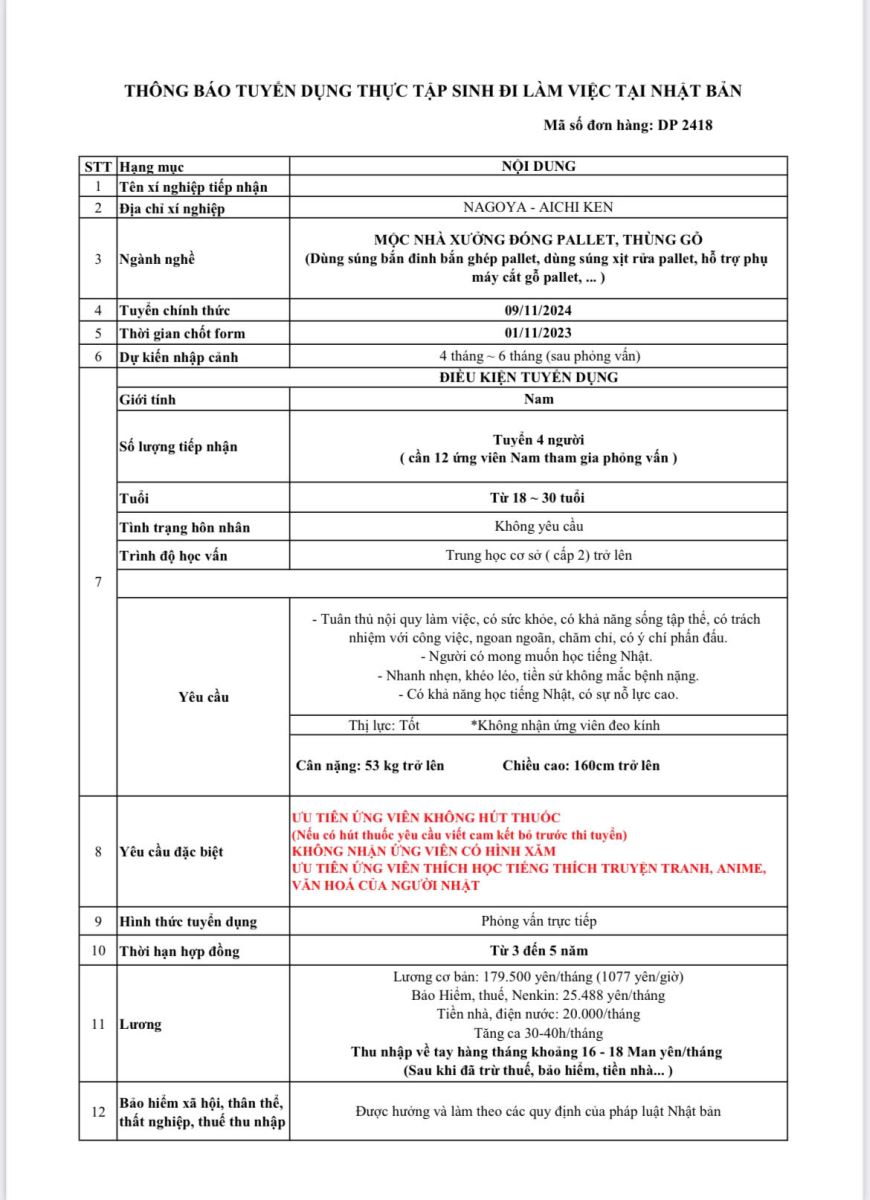 Công việc: Công việc: Đóng các Pallet, thùng gỗ. ( Dùng súng bắn ghép pallet, hỗ trợ máy cắt gỗ pallet...)