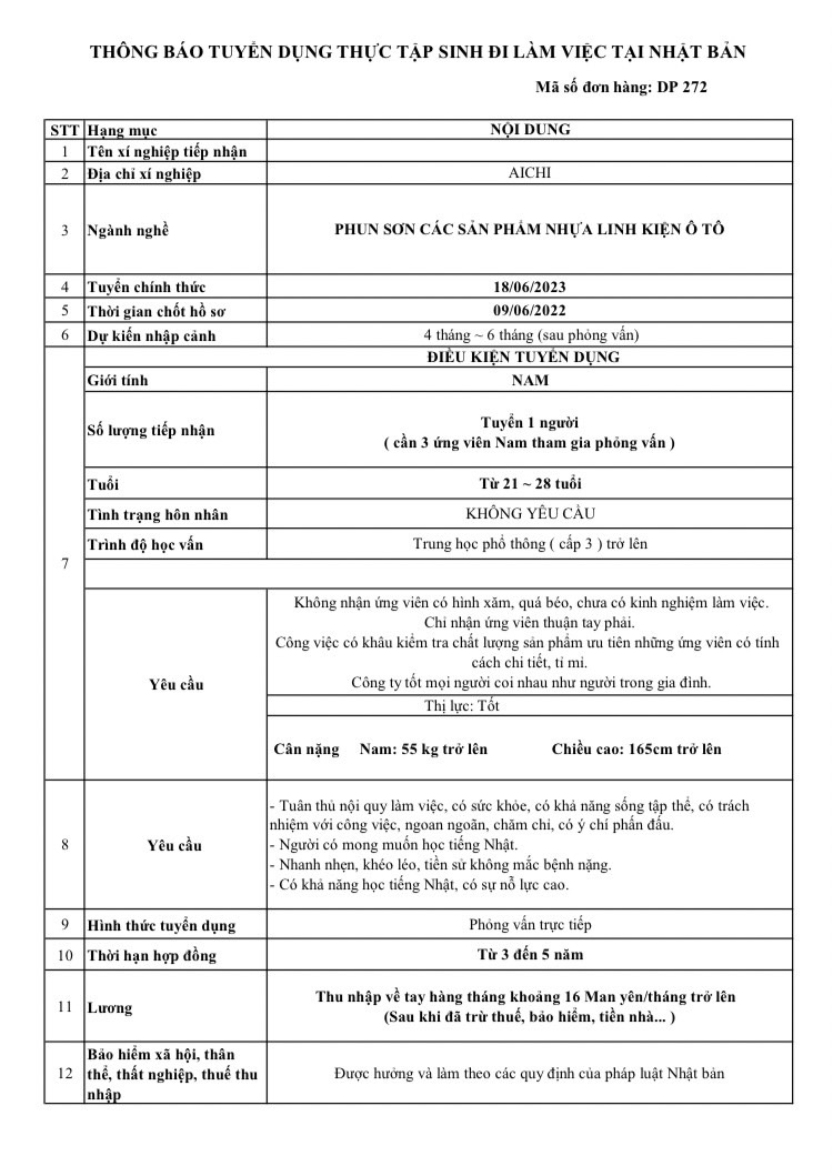 - Nơi làm việc: Tỉnh Aichi – Nhật Bản.