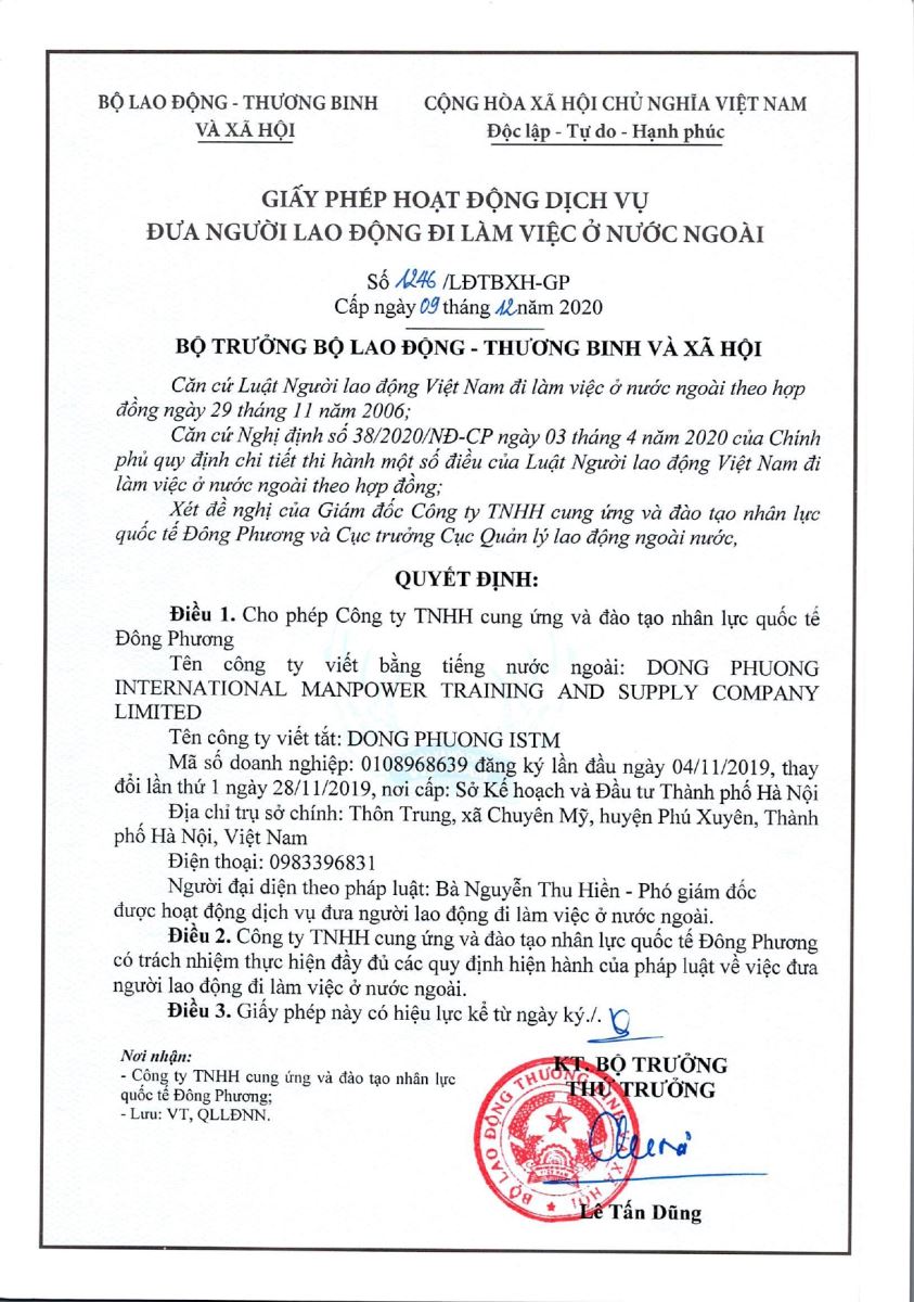 Giấy phép hoạt động dịch vụ đưa người lao động đi làm việc ở nước ngoài