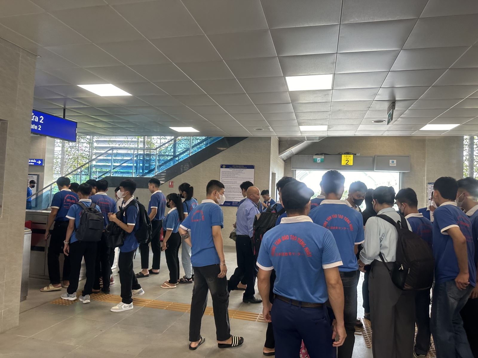 Bắt đầu buổi ngoại khóa, các học viên đã tập trung tại ga tàu điện gần công ty. Đây là lần đầu tiên nhiều bạn có cơ hội sử dụng tàu điện, một phương tiện giao thông phổ biến đặc biệt là Nhật Bản. Các bạn đã được hướng dẫn cách mua vé, tìm hiểu về lịch trình và cách thức di chuyển trên tàu.